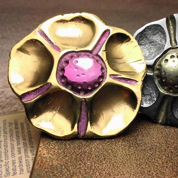 These are two titanium flowers forged by the master forger Victor Acosta in his forge in Toledo. The flowers have been selectively anodized in our Tortosa workshop to achieve different colors as required by the shapes.